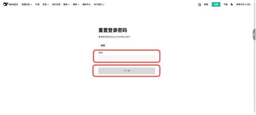 3.请输入您的WHXEX账户邮箱或手机号并点击【下一步】