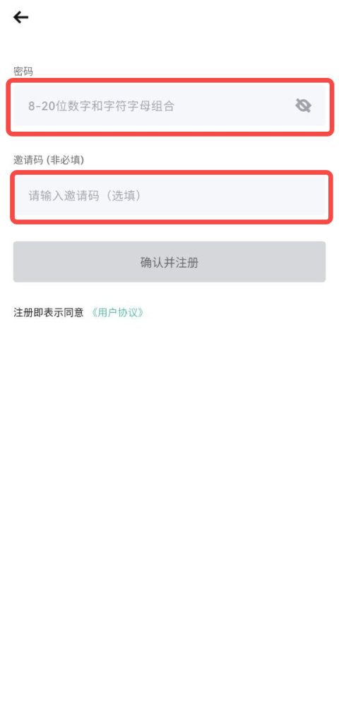 6.请在上方的红框中填写您准备设置的密码。密码需要至少8位,且同时包含数字与字符字母。如果您有邀请码,请在下方的红框中填写。完成填写后,请您点击【确认并注册】